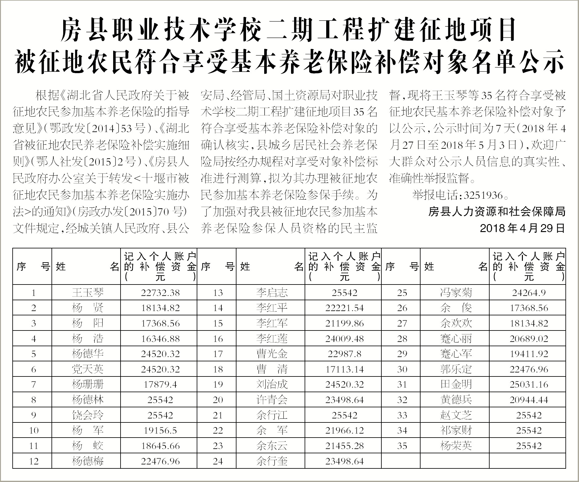 房县职业技术学校二期工程扩建征地项目被征地农民符合享受基本养老保险补偿对象名单公示