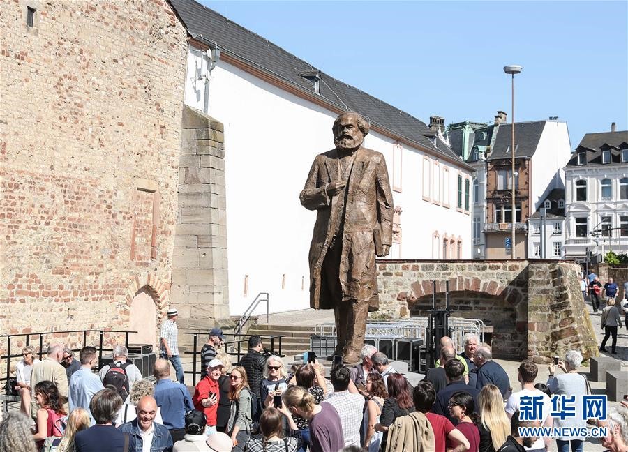 5月5日,在德国特里尔,人们在参观马克思雕像。当日,在马克思诞辰200周年之际,由中国赠送的马克思雕像揭幕仪式在他的故乡——德国西南部城市特里尔举行。雕像重约2.3吨,高4.6米,连同基座总高5.5米,由中国雕塑家吴为山创作。 新华社记者 单宇琦 摄