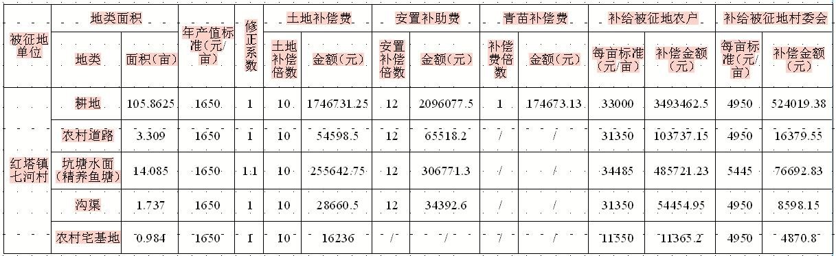 1、征地补偿标准:根据房县征地统一年产值标准,红塔镇属Ⅱ类区,年产值标准为1650元/亩,具体补偿标准和数额见上表。