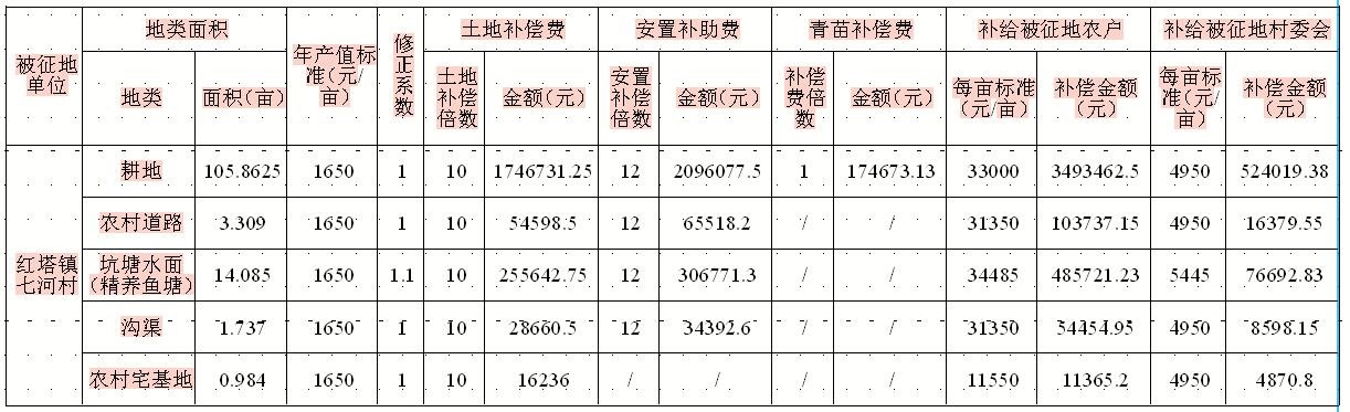 根据房县征地统一年产值标准,红塔镇属Ⅱ类地区,年产值标准为1650元/亩。具体补偿标准和数额见下表。