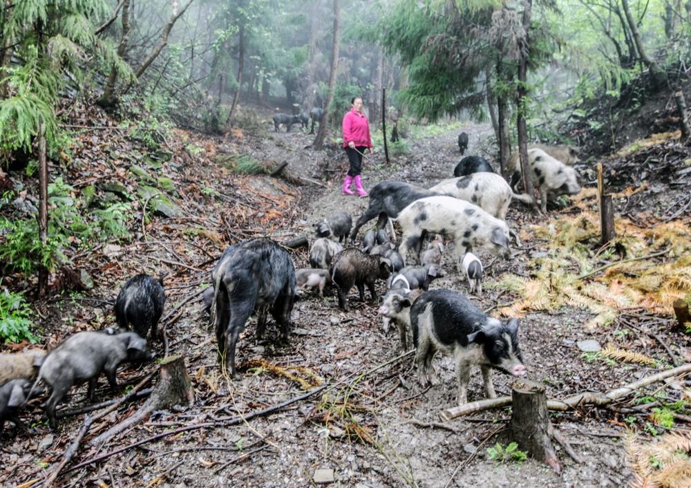 上图:5月3日,门古寺镇黄柏沟村2组农民邓付秀正在山上放养土猪。近几年来,冯瑞祥、邓付秀夫妇靠发展养土猪走上致富路。今年,他们家养土猪130多头,预计纯收入15万多元。