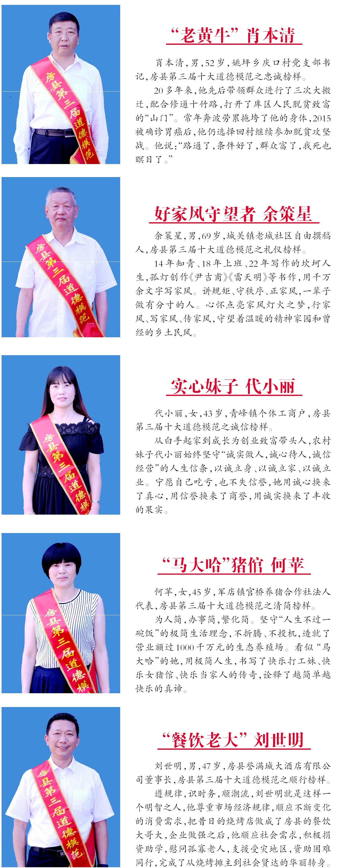 道德模范是有形的正能量,鲜活的价值观。他们在平凡的工作岗位上,用点点滴滴的善行义举传递着正能量,传承了中华民族传统美德,成为全县人们学习的楷模。为大力宣传和弘扬道德模范的先进事迹和感人精神,在全社会掀起学习道德模范、崇尚道德模范、争当道德模范的良好氛围,今天,本报特刊登十大道德模范事迹简介,让我们一起走近他们。
