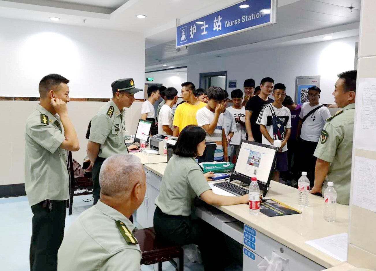 上图:近日,来自全县各乡镇的首批应征青年在县人民医院进行体检。据了解,今年我县网上报名参军人数970人,经过初轮筛选,490人确定为预征对象,与去年相比进站率减少29%,大学生达到165人。根据计划,我县将于8月10日至20日开始役前训练,8月18日至19日组织新兵复查,9月上旬启运新兵,9月底全部完成新兵输送。