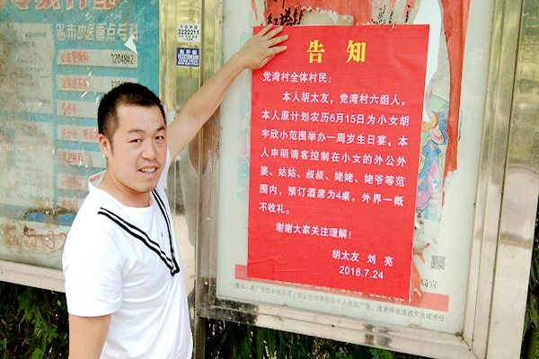 本报讯 (通讯员赵先华) 近日,红塔镇党湾村民委员会外贴出一张特殊的告知书,引得村民争相观看。党湾村六组村民胡太友在告知书中告诉广大村民和亲朋好友:计划农历6月15为小女举办一周岁生日宴,申明只招待小女儿的外公外婆、爷爷奶奶等,只办四桌酒席,外界一概不收礼。党员干部带头,各村红白理事会参与,红塔镇的红白喜庆事宜操办方式如今正悄然改变,大操大办比阔气的少了,低调务实讲感情的多了。