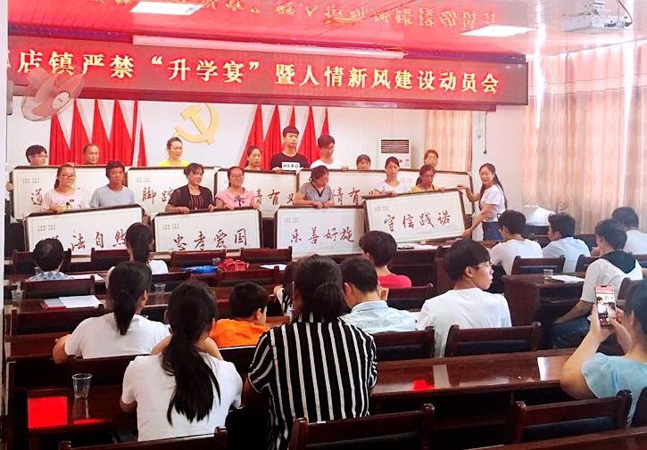 8月16日,军店镇举办集体庆祝升学仪式,以一种简朴、节俭、文明的方式为该镇44名金榜题名学子送上深深祝福。为巩固人情新风成果,预防升学宴卷土重来,活动中,镇党委政府同与会80多名学子和家长签订《不参与不举办升学宴承诺书》,并为学子们颁发家风牌匾。 (杨义德 韩胜泽 摄)
