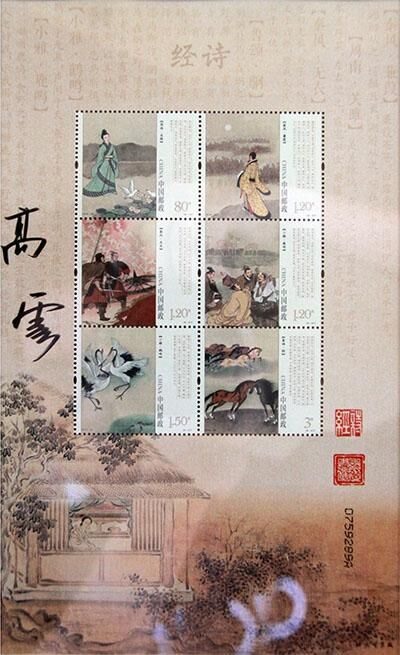 据悉,这套由中国邮政集团公司在全国发行的《诗经》特种邮票共6枚。分别表现《周南·关雎》《秦风·蒹葭》《秦风·无衣》《小雅·鹿鸣》《小雅·鹤鸣》《鲁颂·駉》六个内容,全套邮票面值8.90元。邮票采用传统工笔手法,虚实相间,艺术化地渲染了诗歌意境。