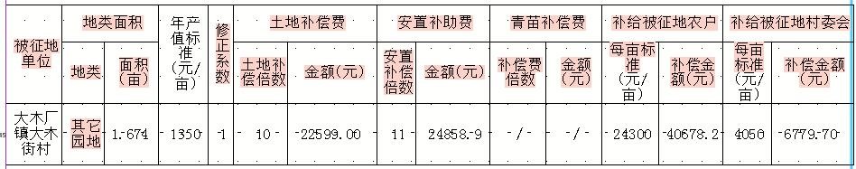 1、征地补偿标准:根据房县征地统一年产值标准,大木厂镇属Ⅳ类地区,年产值标准为1350元/亩。具体补偿标准和数额见上表。