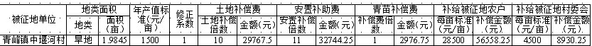 根据房县征地统一年产值标准,青峰镇属Ⅲ类地区,年产值标准为1500元/亩。具体补偿标准和数额见上表。