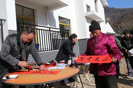 12月18日,窑淮镇西沟村32户贫困户集体搬迁。当天,县文联组织书协免费为贫困户书写精准扶贫对联50多幅,并上门祝福为其赠送对联。据悉,此次活动为县文联开展送文艺助推精神扶贫活动的一个缩影,活动前期由县文联组织县诗词楹联学会创作、收集一批精品扶贫对联,再组织房县书法家协会赴各精准扶贫搬迁小区,现场书写并免费赠送给贫困户。 (张立林 摄)