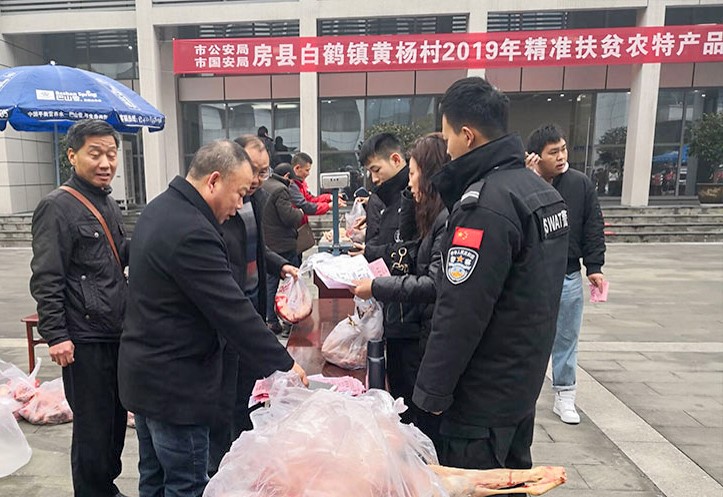 日前,白鹤镇黄杨村农户自产的牛羊肉、香菇木耳、桃花酿酒等农产品在市警训基地集中销售。展销会从上午8点一直持续到中午12点多,展销的肉类2600余斤、土鸡150多只、土鸡蛋23000余枚、黄酒1500余斤、木耳香菇1300余斤被选购一空,当场交易额达近15万元,有力带动黄杨村贫困户增收。 (佰河轩 摄)