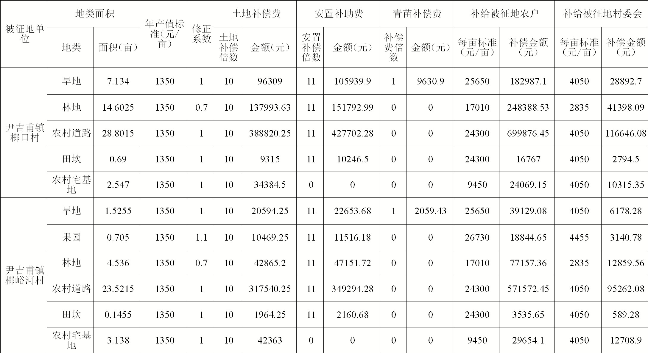 1、征地补偿标准:根据房县征地统一年产值标准,尹吉甫镇属Ⅳ类地区,年产值标准为1350元/亩。具体补偿标准和数额见上表。