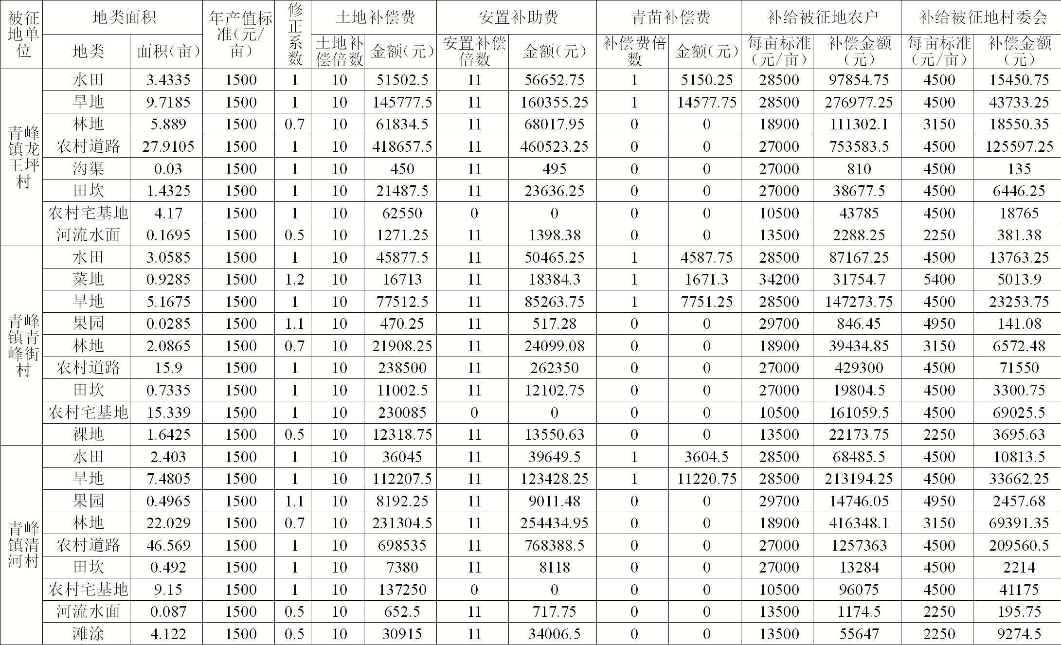 1、征地补偿标准:根据房县征地统一年产值标准,青峰镇属Ⅲ类地区,年产值标准为1500元/亩。具体补偿标准和数额见上表。