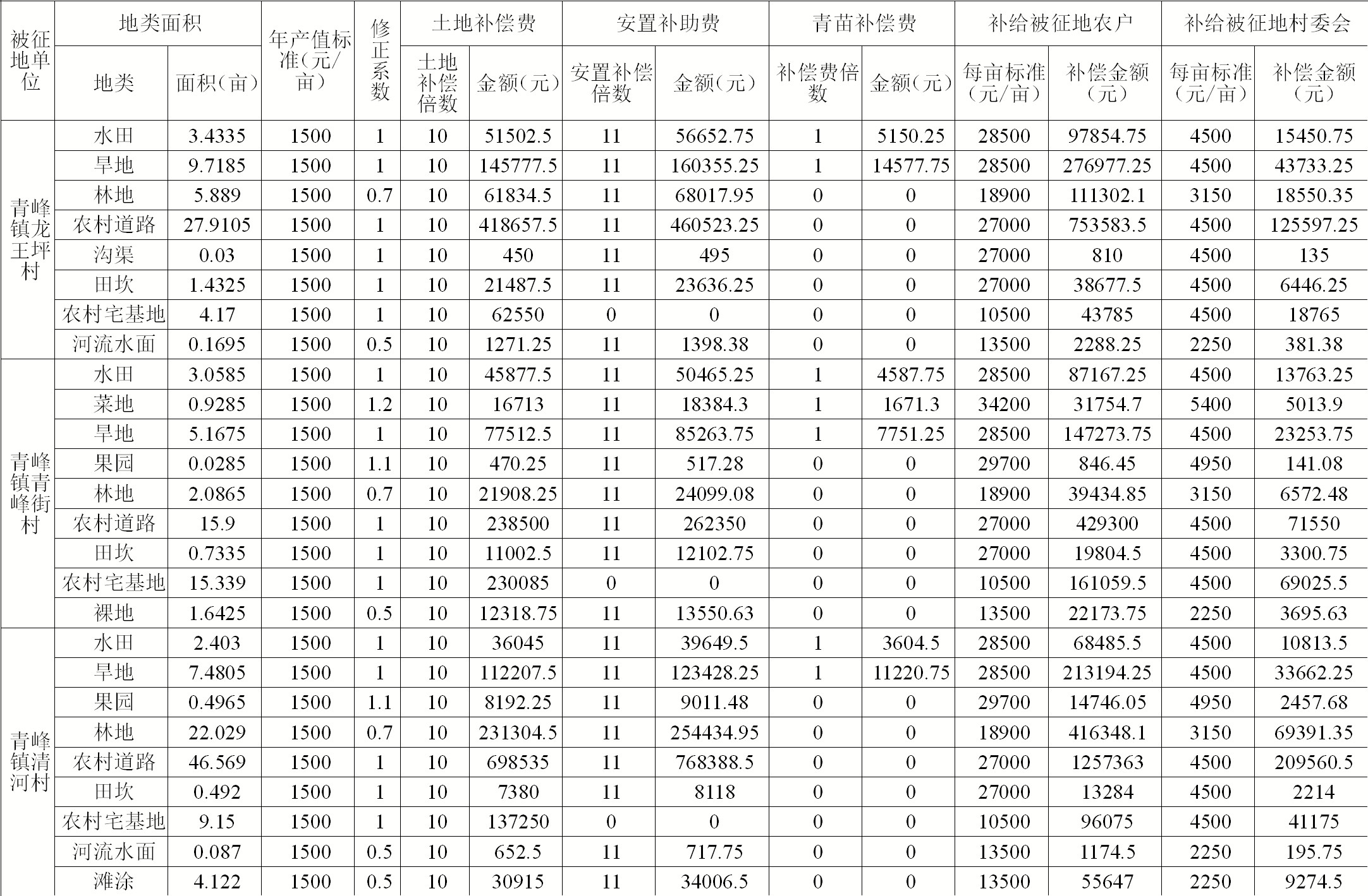 1、征地补偿标准:根据房县征地统一年产值标准,青峰镇属Ⅲ类地区,年产值标准为1500元/亩。具体补偿标准和数额见上表。