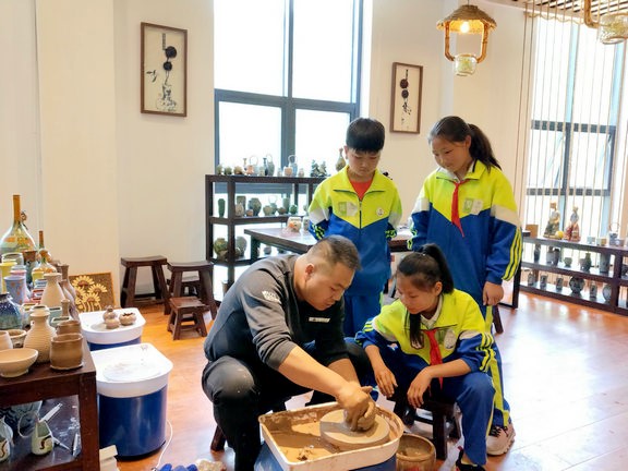 近日,军店小学组织三百余名学生前往土城镇黄酒民俗文化村,开展春季研学旅行活动。活动中,孩子们观看了精彩的诗经名篇传唱,了解了黄酒传统酿造工序,走进陶艺馆厅亲手制作陶罐和花瓶(如图),在五谷画手工室用稻、黍、稷、麦、豆粘贴拼成手工画,并登上茶山学习有关茶树的知识。活动的开展,让学生们进一步了解了家乡,提高了学生的综合素质和实践能力。 (郭品丽 摄)