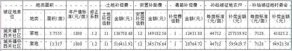 4、征收面积:被征收土地总面积1.2715公顷(折合19.0725亩),其中:下西关社区0.3837公顷(折合5.7555亩),中西关社区0.8878公顷(折合13.3170亩),详细分类面积见上表。