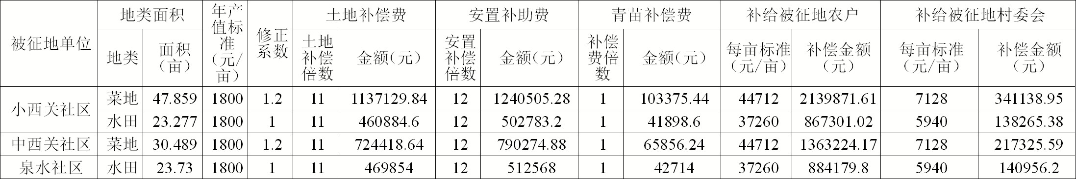4、征收面积:被征收土地总面积8.3570公顷(折合125.3550亩),其中:小西关社区4.7424公顷(折合71.1360亩),中西关社区2.0326公顷(折合30.4890亩),泉水社区1.5820公顷(折合23.7300亩),详细分类面积见上表。