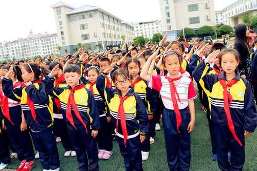 “准备着,时刻准备着,为共产主义事业,贡献一切力量!”5月29日,在东城小学庆“六一”新队员入队仪式上,225名学生在队旗下庄严宣誓,加入中国少年先锋队。 (李英 摄)