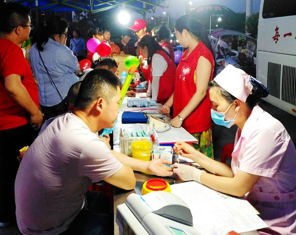 舞台前方的采血点围满了前来献血的市民,市中心血站工作人员在志愿者们的协助下,对献血者进行登记、血检、采血。同时,还向过往行人宣传献血科普知识,引导市民参与到无偿献血中来。