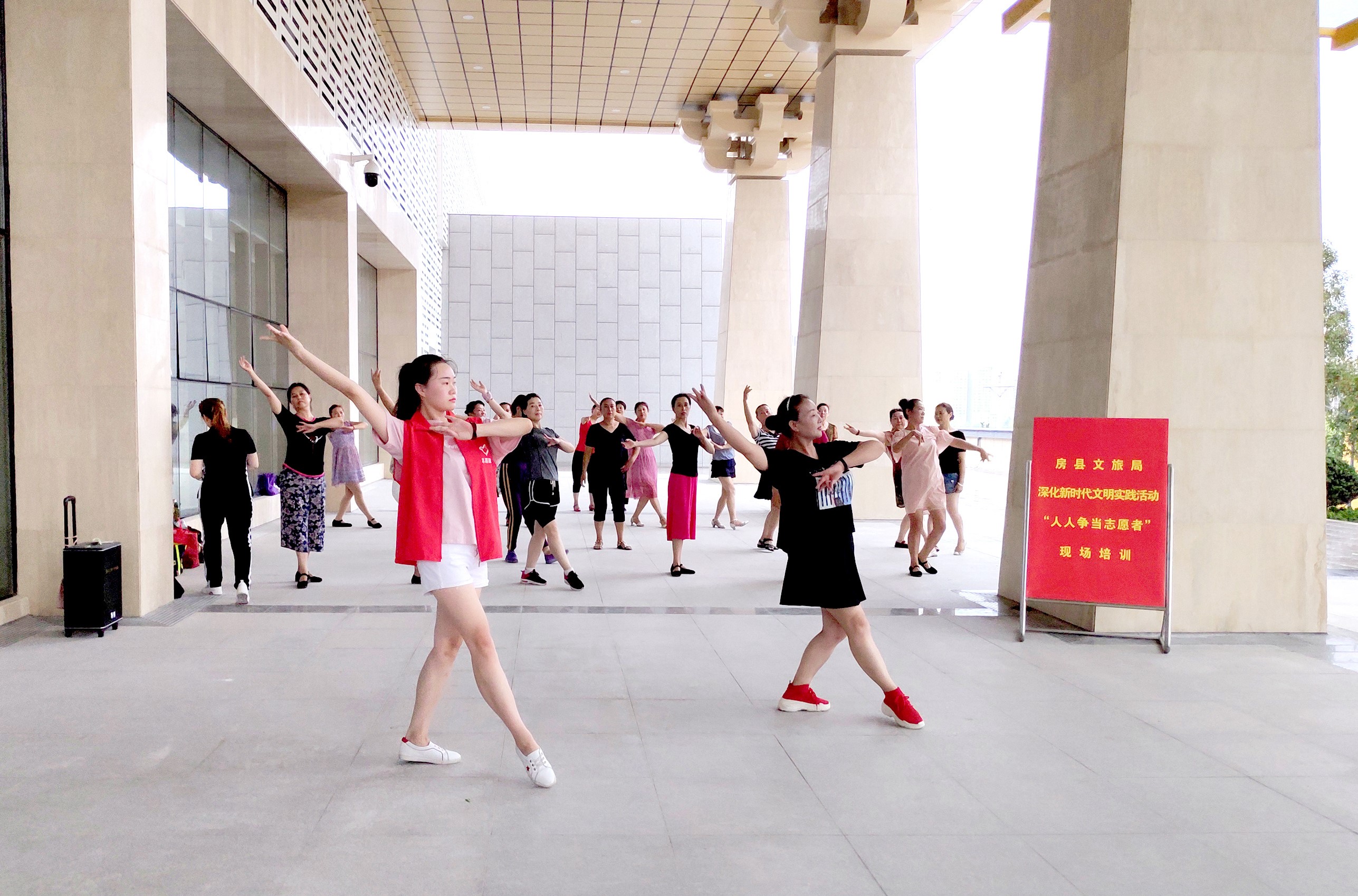 近日,县文旅局组织全县近百名文化文艺志愿者开展“广场舞”培训。据悉,本次培训为期5天,由县文化馆专业老师授课。培训打通了公共文化服务“最后一公里”,增强了公共文化服务的针对性和有效性,进一步推动了我县新时代文明实践工作。(雷阳 摄)