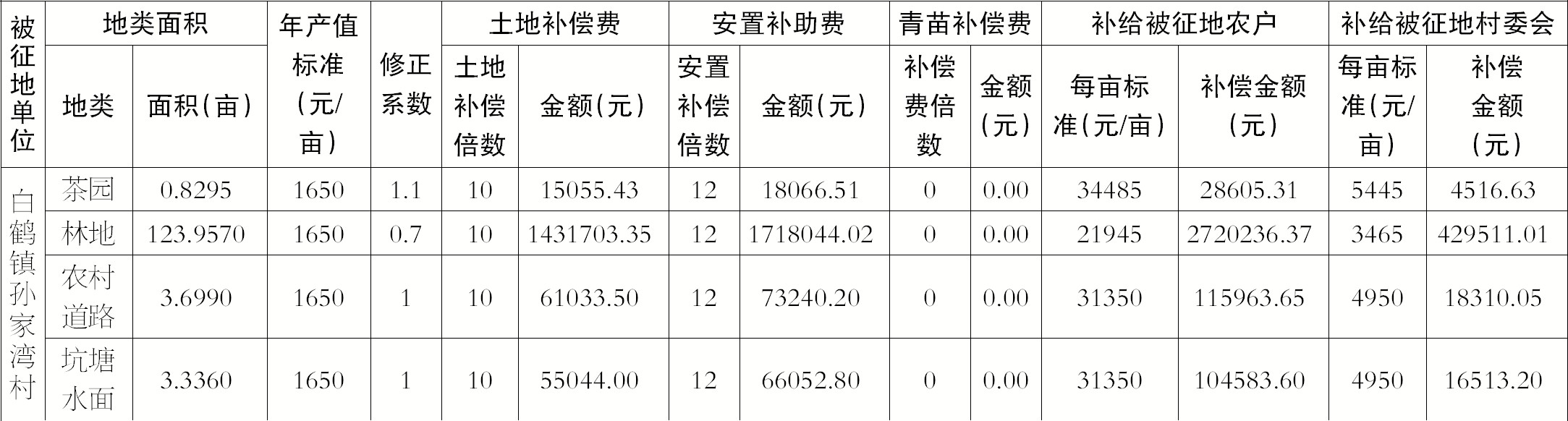 1、征地补偿标准:根据房县征地统一年产值标准,白鹤镇属Ⅱ类地区,年产值标准为1650元/亩。具体补偿标准和数额见下表。