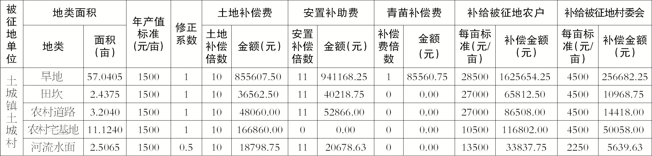 1、征地补偿标准:根据房县征地统一年产值标准,土城镇属Ⅲ类地区,年产值标准为1500元/亩。具体补偿标准和数额见下表。