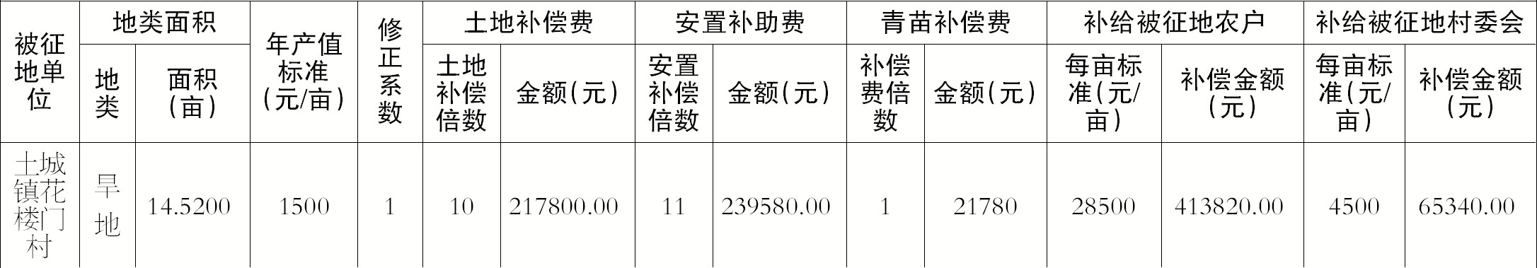 1、征地补偿标准:根据房县征地统一年产值标准,土城镇属Ⅲ类地区,年产值标准为1500元/亩。具体补偿标准和数额见下表。