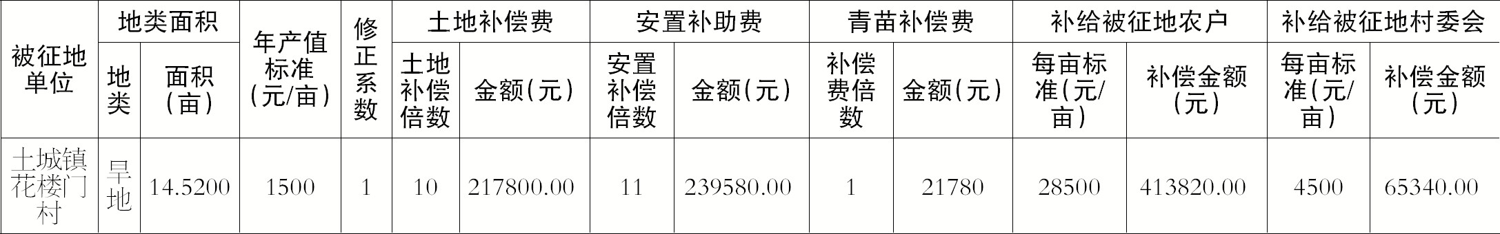 1、征地补偿标准:根据房县征地统一年产值标准,土城镇属Ⅲ类地区,年产值标准为1500元/亩。具体补偿标准和数额见下表。