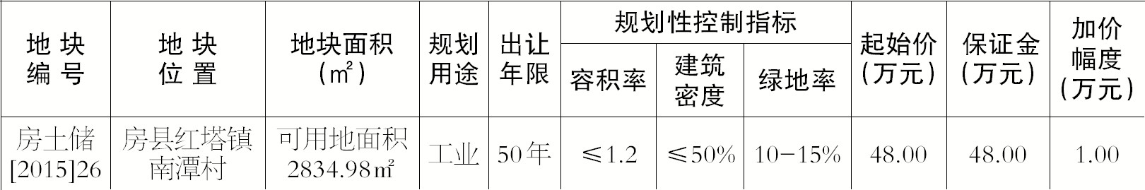 竞得房土储〔2015〕26号地块的必须按照城市规划拟定的工业用地详规进行建设;具备竞买条件的请于2019年9月17日下午5:30时前,到房县自然资源和规划局六楼土地收购储备中心提出竞买申请并报名,接受资格审查,经审查符合竞买资格者方可领取国有建设用地使用权出让文本,并交付竞买保证金。竞买保证金必须在报名期限内到房县土地收购储备中心指定的银行缴付,竞得土地使用权后保证金可抵作出让价款,未竞得者,挂牌成交后7日内办理退款手续(不计息)。