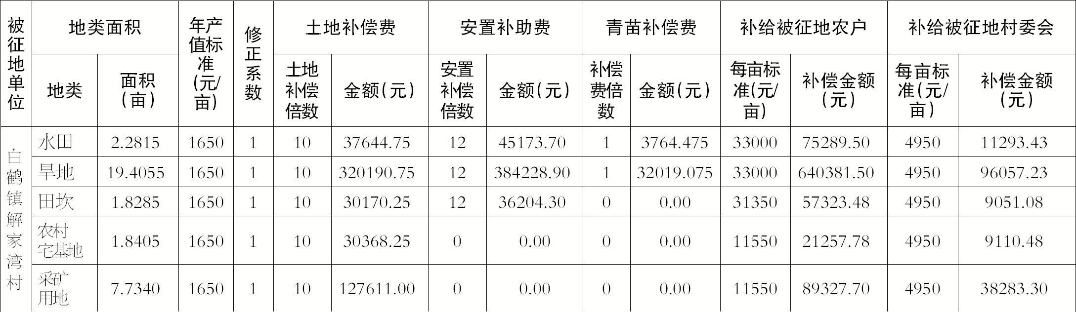 1、征地补偿标准:根据房县征地统一年产值标准,白鹤镇属Ⅱ类地区,年产值标准为1650元/亩。具体补偿标准和数额见下表。