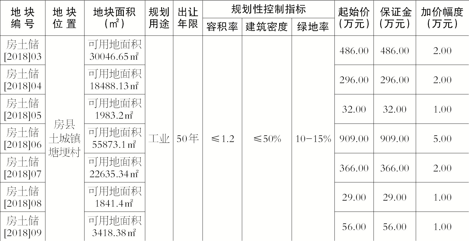 竞得房土储〔2018〕03、04、05、06、07号、08号、09号地块的必须按照城市规划拟定的工业用地详规进行建设;具备竞买条件的请于2019年10月18日下午5:30时前,到房县自然资源和规划局六楼土地收购储备中心提出竞买申请并报名,接受资格审查,经审查符合竞买资格者方可领取国有建设用地使用权出让文本,并交付竞买保证金。竞买保证金必须在报名期限内到房县土地收购储备中心指定的银行缴付,竞得土地使用权后保证金可抵作出让价款,未竞得者,挂牌成交后7日内办理退款手续(不计息)。