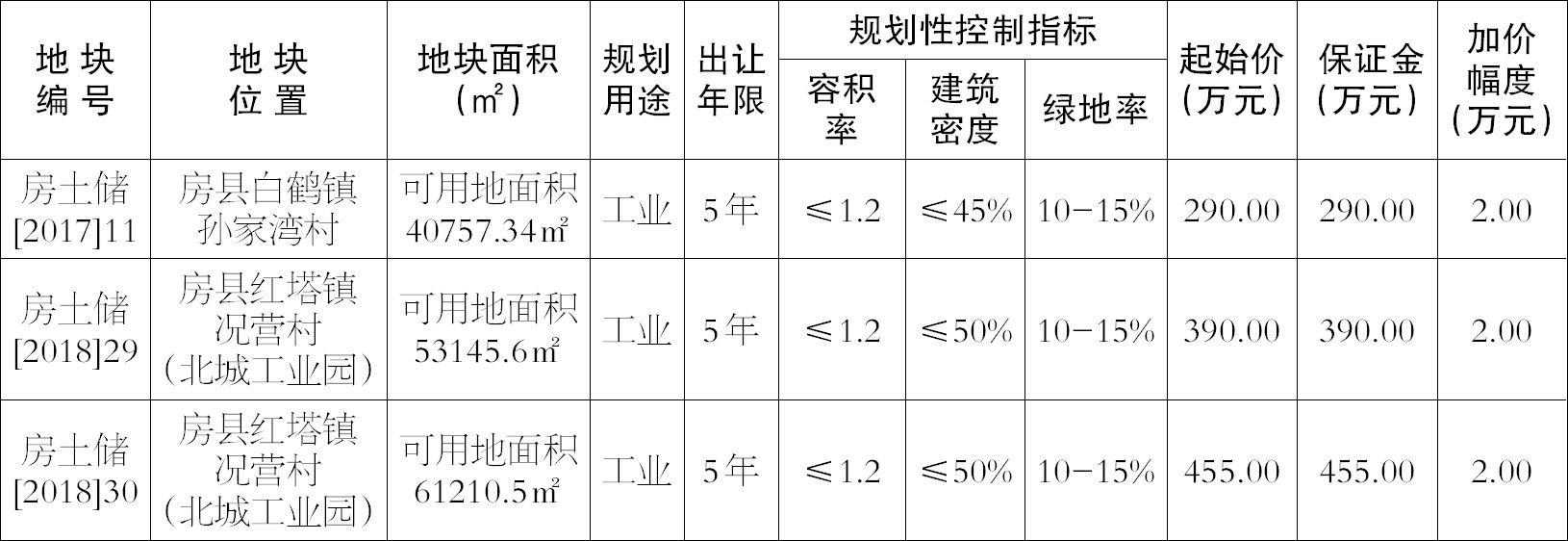 竞得房土储〔2017〕11号、房土储〔2018〕29号、房土储〔2018〕30号地块的必须按照城市规划拟定的工业用地详规进行建设;具备竞买条件的请于2019年10月31日下午5:30时前,到房县自然资源和规划局六楼土地收购储备中心提出竞买申请并报名,接受资格审查,经审查符合竞买资格者方可领取国有建设用地使用权出让文本,并交付竞买保证金。竞买保证金必须在报名期限内到房县土地收购储备中心指定的银行缴付,竞得土地使用权后保证金可抵作出让价款,未竞得者,挂牌成交后7日内办理退款手续(不计息)。