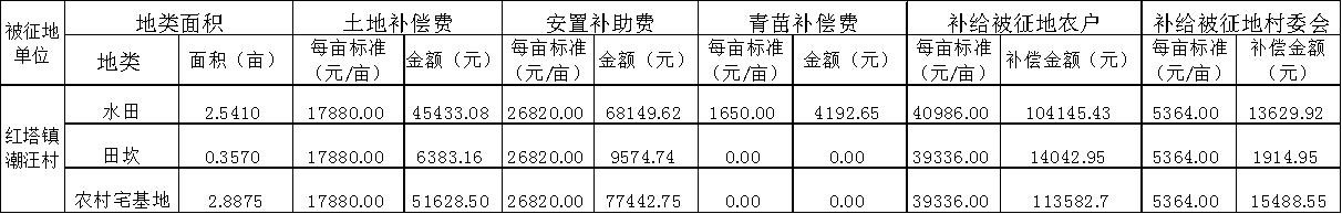 1、征地补偿标准(含土地补偿费、安置补助费) ;按照《湖北省人民政府关于公布实施湖北省征地区片综合地价标准的通知》(鄂政发〔2019〕22号)规定的房县征地区片综合地价标准,红塔镇潮汪村属Ⅱ类区域,区片综合地价标准为44700.00元/亩。