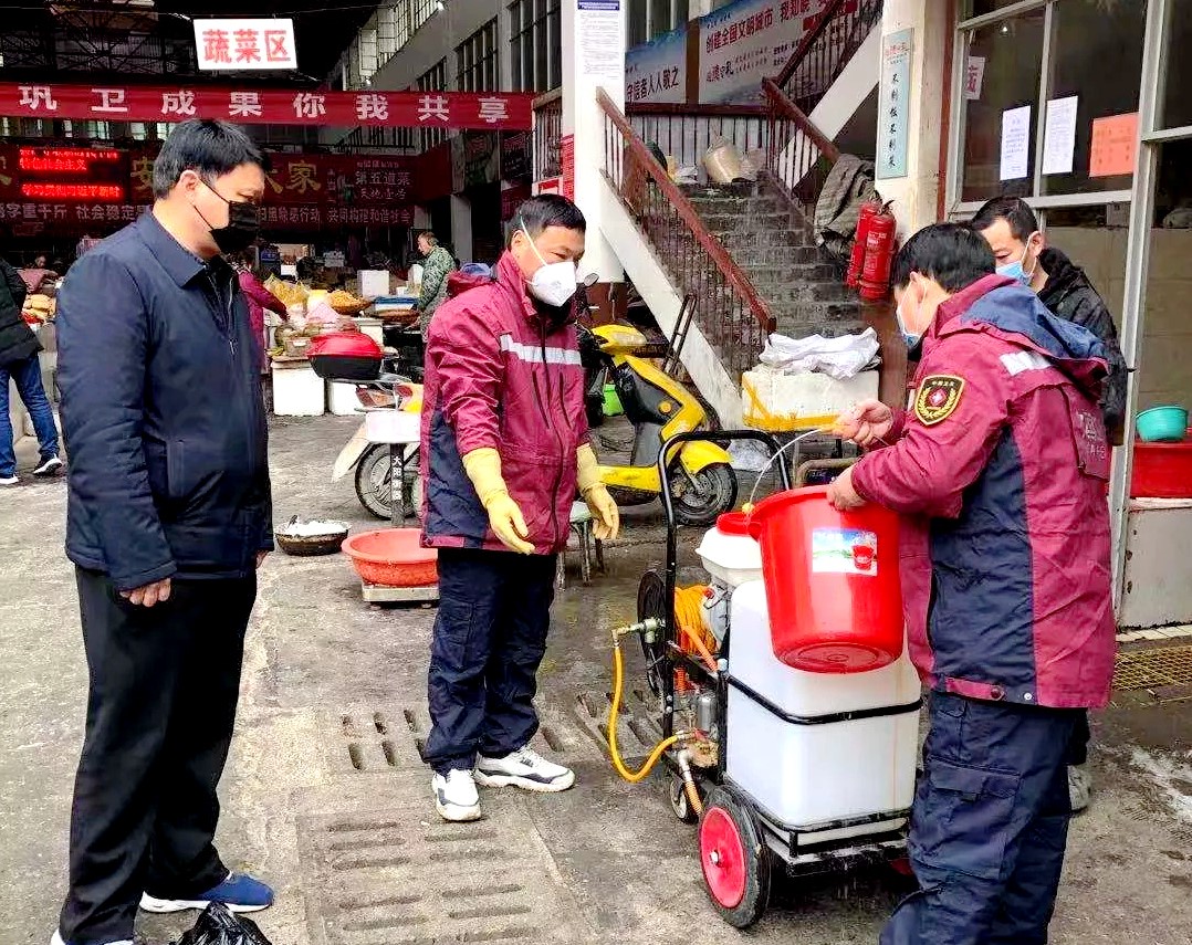 1月23日上午,县执法局市场中心工作人员对集贸市场活禽销售区进行全面消毒。