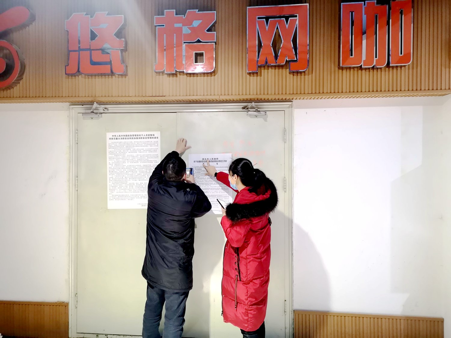 为有效防止新型冠状病毒感染的肺炎疫情扩散蔓延,切实保障人民群众身体健康和生命安全,县文旅局执法人员认真落实文化市场疫情防控各项工作,严格督促文化市场经营单位暂停对外营业。截至1月24日晚6点,全县19家公共娱乐场所(包括网吧、KTV、影院)已全面关停。疫情期间,一旦发现未落实停业要求擅自对外营业的,该局将核实情况后立即移交公安部门,严格依法查办。 (陆磊 摄)
