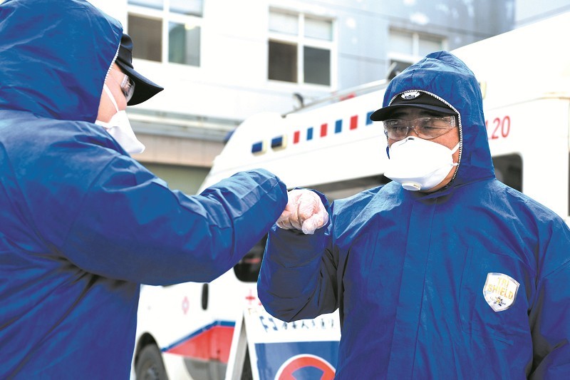 新冠肺炎疫情发生以来,共产党员、县公安局内保大队58岁民警谭军主动请战,一直坚守在担负确诊病例治疗的县人民医院,执行保卫任务,维护医疗秩序。2月11日清晨,谭军(右)击拳给年轻民警鼓劲加油。 (魏世银 摄)