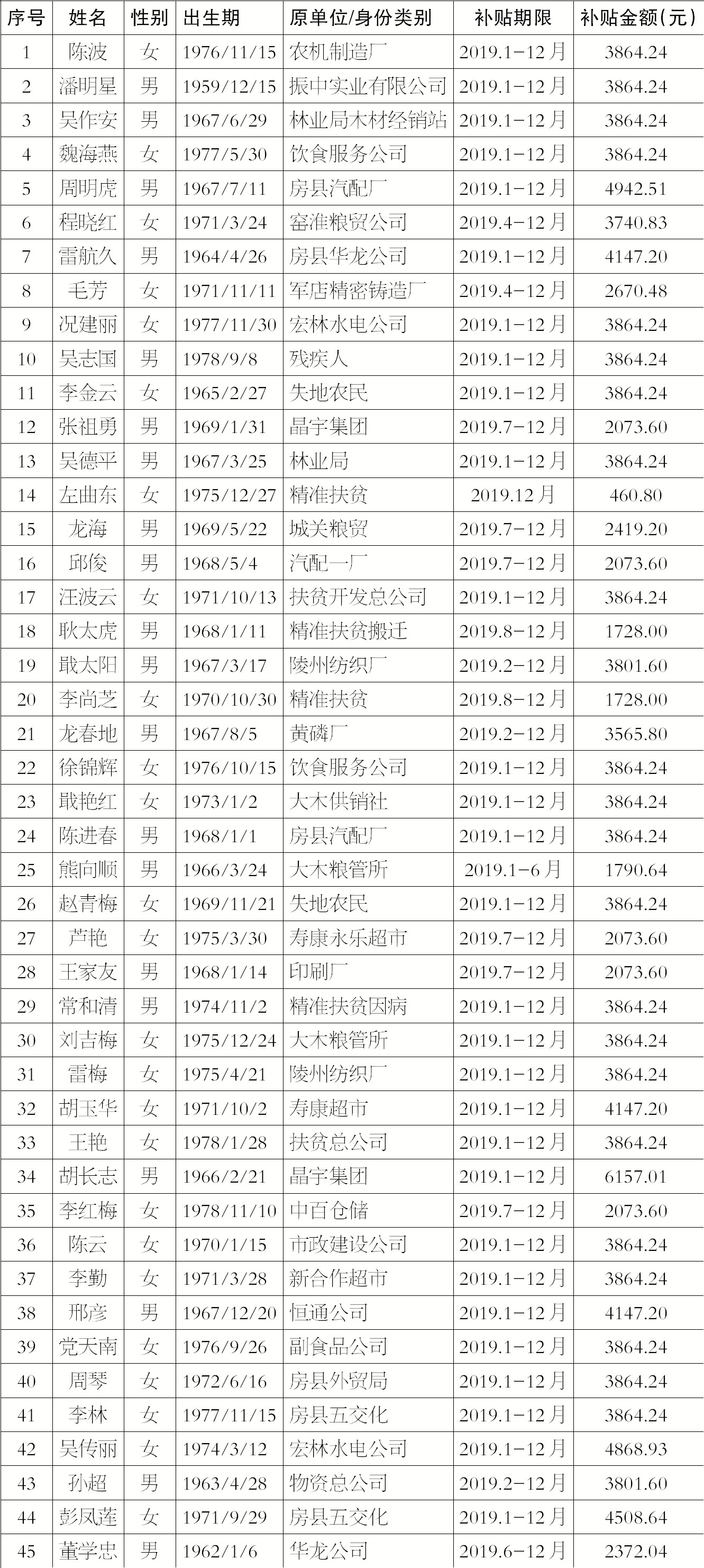 为进一步规范社保补贴申请认定发放工作,根据《湖北省就业促进条例》《省财政厅省人力资源和社会保障厅关于印发<湖北省就业补助资金管理办法>的通知》(鄂财社发〔2017〕102号)、《房县人力资源和社会保障局关于<开展房县灵活就业困难人员和用工单位社会保险补贴申报认定发放工作>的通知》(房人社发〔2016〕32号)等文件规定,经灵活就业困难人员本人申报,县就业局按程序进行了初审,拟给予社保补贴,现将初审通过的88位人员名单予以公示。