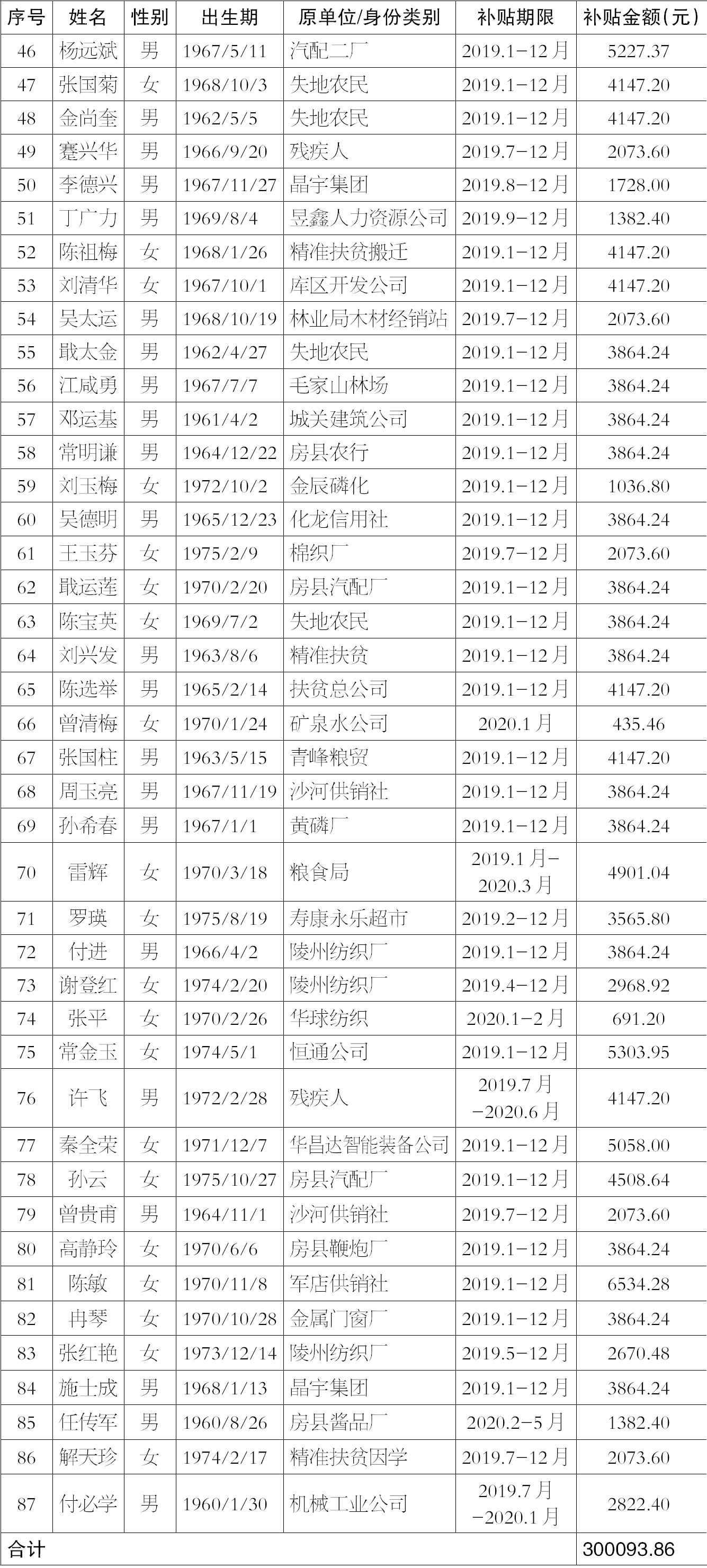 一、灵活就业困难人员享受社保补贴人员名单(共87人)