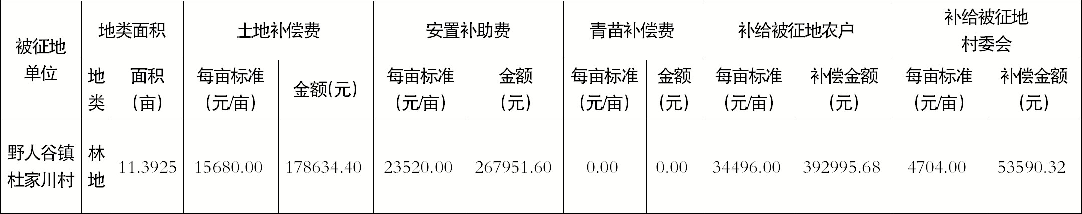 1、征地补偿标准(含土地补偿费、安置补助费):按照《湖北省人民政府关于公布实施湖北省征地区片综合地价标准的通知》(鄂政发〔2019〕22号)规定的房县征地区片综合地价标准,野人谷镇杜家川村属Ⅲ类区域,区片综合地价标准为39200.00元/亩。