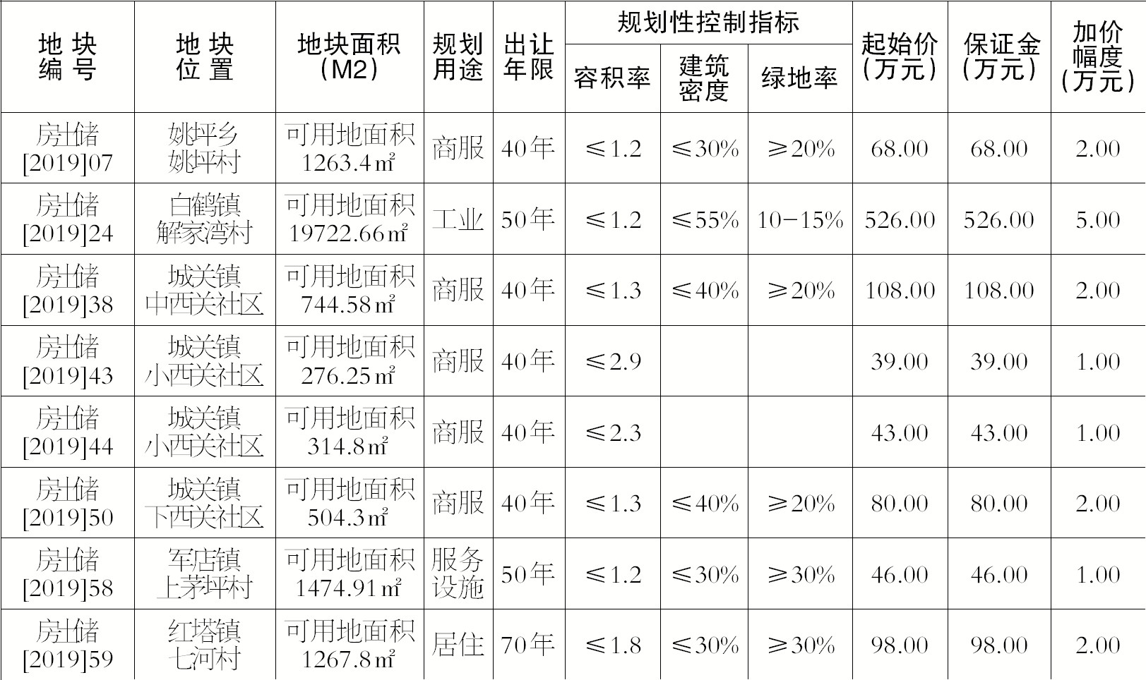 2、本次出让的宗地以现状条件出让,房土储〔2019〕38、43、44、50号宗地宗地由西关片区棚改项目指挥部负责交地;房土储〔2019〕07号宗地由房县姚坪乡人民政府负责交地;房土储〔2019〕24号宗地由房县白鹤镇人民政府负责交地;房土储〔2019〕58号宗地由房县军店镇人民政府负责交地;房土储〔2019〕59号宗地由房县红塔镇人民政府负责交地。