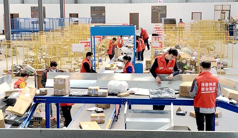 4月25日,在房县物流快递共配中心,工作人员正在上岗工作,这标志着房县“快递联合”统配处理正式投入运行。房县“快递联合”统配由湖北怡嘉商贸有限公司联合申通、圆通、中通、百世和韵达快递5家公司共同组成,拥有快递包件处理作业用房3000多平米,每小时可处理千件包件。该中心直接与全县20个乡镇的180个电商物流站点对接,集中分拣后由中心直接分送到各乡镇电商物流站,大大地降低了快递企业的运行成本。(周娥 摄)