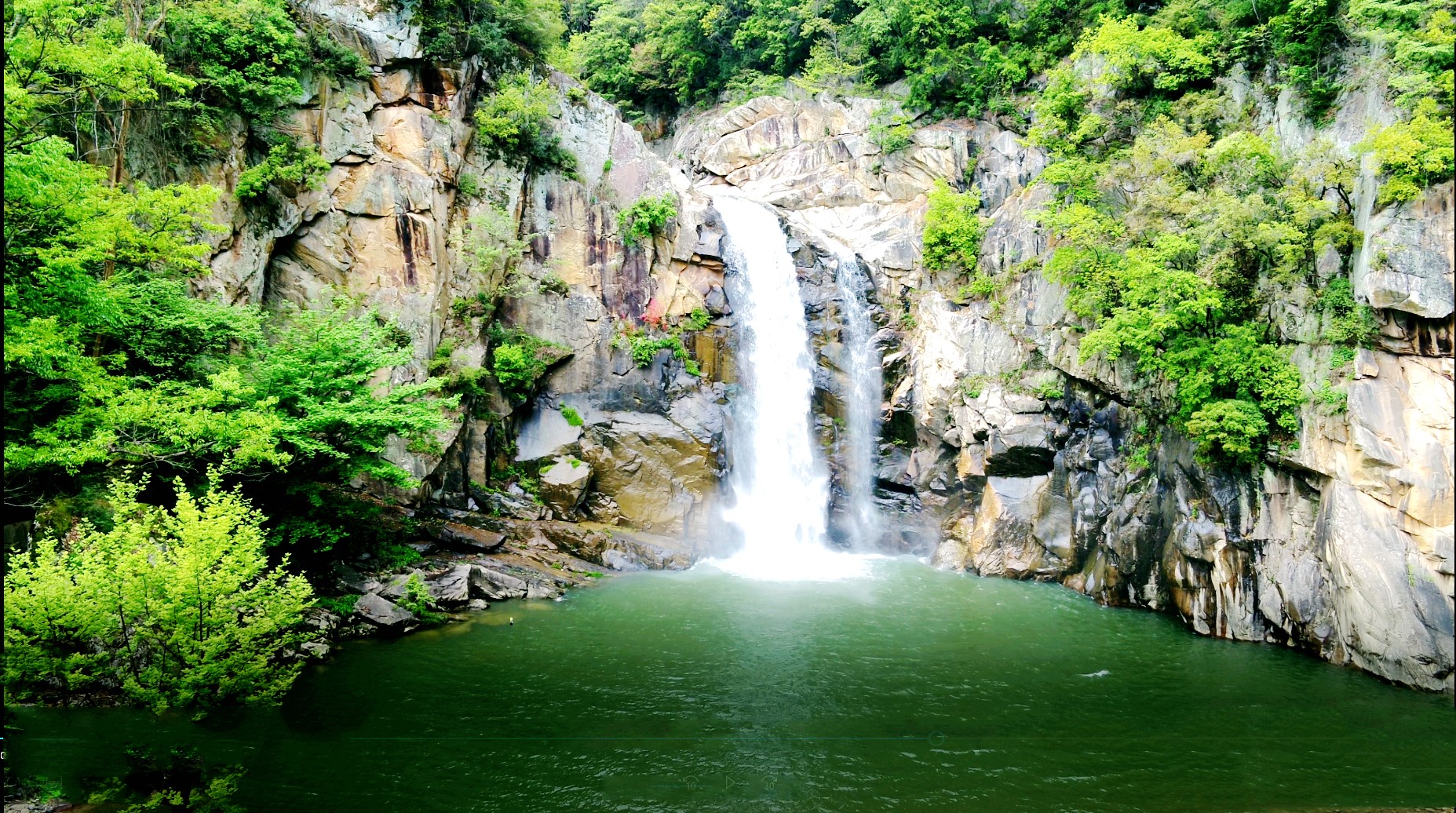 龙潭坎壁立千仞,宛如刀切,瀑布落差 35 米,宽约 6 米。放眼望去,河水从坎上飞泻而下,飞瀑如卷帘翻滚着白色的浪花,飞溅着似玉如银的水珠,闪烁着五彩缤纷的霞光,迸发出巨大的声响,气势恢宏而磅礴,豪迈而坦荡。