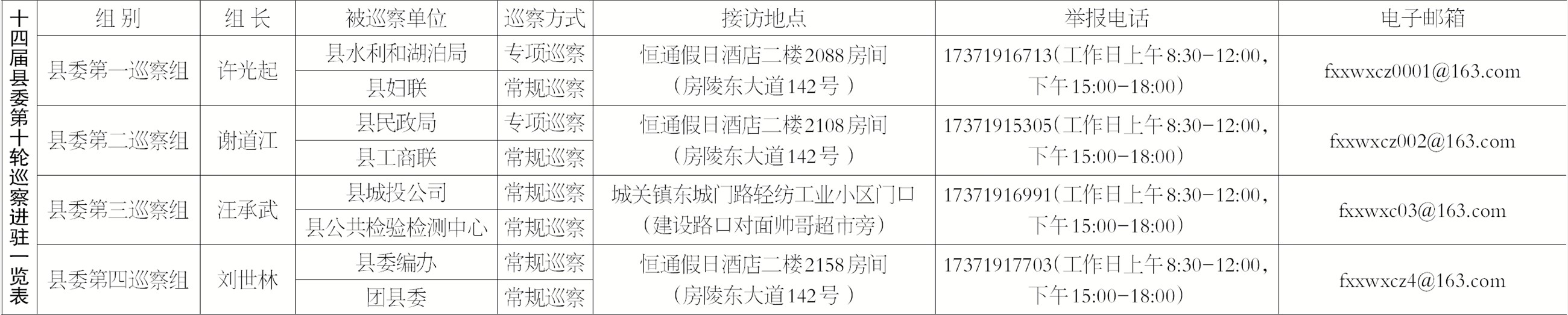 根据省委巡视工作统一部署,县委决定采取巡视巡察上下联动方式对县民政局、县水利和湖泊局开展专项巡察;对县委编办、县工商联、县妇联、团县委、县公共检验检测中心、县城投公司等6家单位开展常规巡察,同步开展基层组织建设、意识形态工作专项检查。截至7月14日,县委第一至第四巡察组已完成对8个党组织的进驻工作,十四届县委第十轮巡察全面展开。