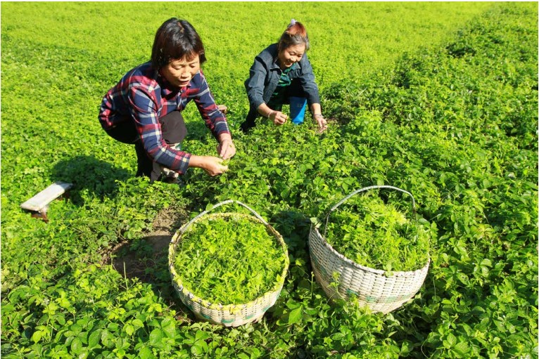 日前,野人谷谭家湾村农户在采摘绞股蓝。近年来,我县大力发展中药材产业,依托神农本草、陵州药业、三鑫生物、赟天生物等县内医药产业龙头企业,通过推广“租金+薪金+股金”模式,在军店镇、门古寺镇、化龙堰镇等乡镇发展中药材种植示范基地 11万亩,年产中药材10.8万吨、产值 5.1亿元,累计带动贫困户1620户4998 人增收致富。(刘瑞 阮英东 摄)
