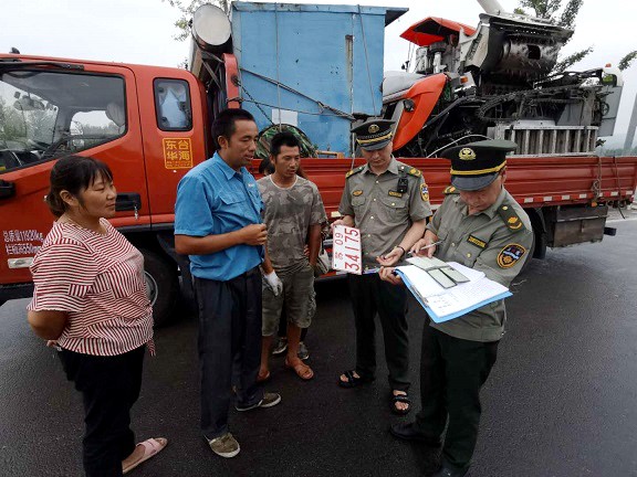 近日,县农机服务中心农机执法人员利用下雨天收割机不能下田作业的有利时机,对窑淮、化龙、红塔等乡镇,从事水稻跨区机收的联合收割机安全技术状况进行突击检查。农机监理执法人员对极个别联合收割机存在证驾不符现象进行批评教育,责令其限期整改,确保机收作业安全。 (姚全胜 摄)