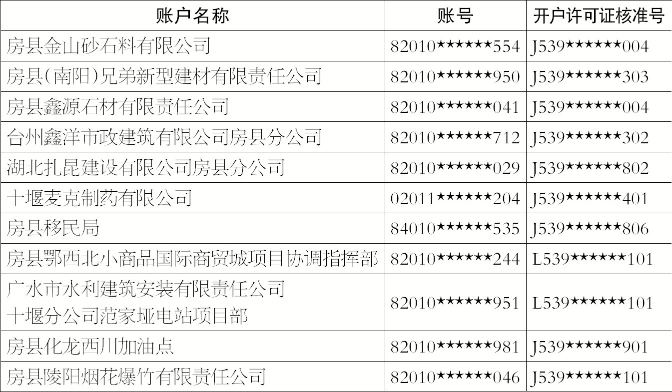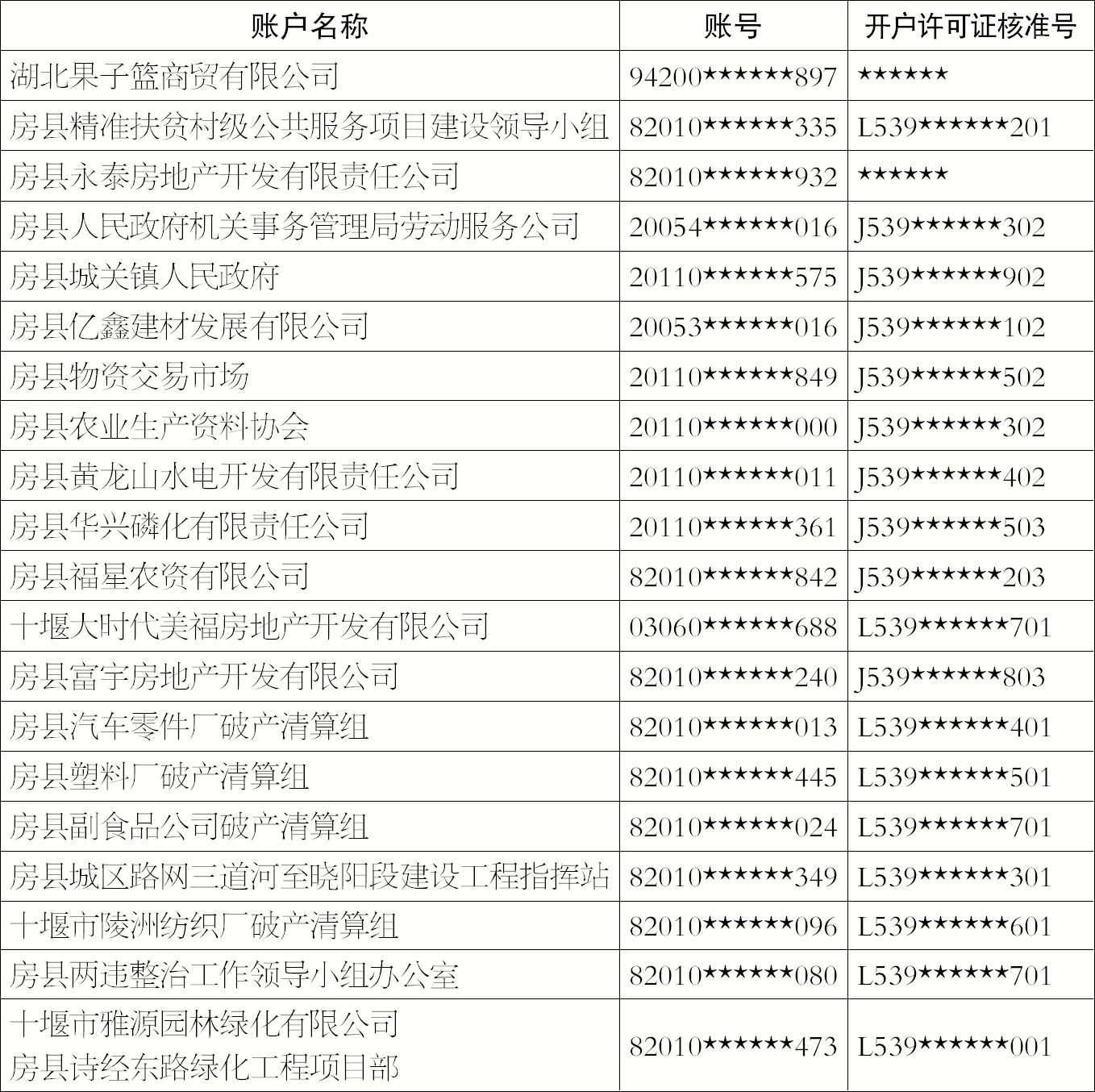 为规范人民币结算账户的使用,加强银行结算账户的管理,根据中国人民银行《人民币银行结算账户管理办法》,房县农商行对在辖内所有网点开立的单位结算账户进行了清理,以下30户(见清单)经逐户核实,缺失相关资料,属于不合规的单位结算账户。公示之日起下列账户将停止使用,请下列单位自本公告发布之日起30日内到开户银行办理合规手续,逾期我行将按账户管理相关规定进行处理,由此产生的纠纷由账户持有单位自行承担。