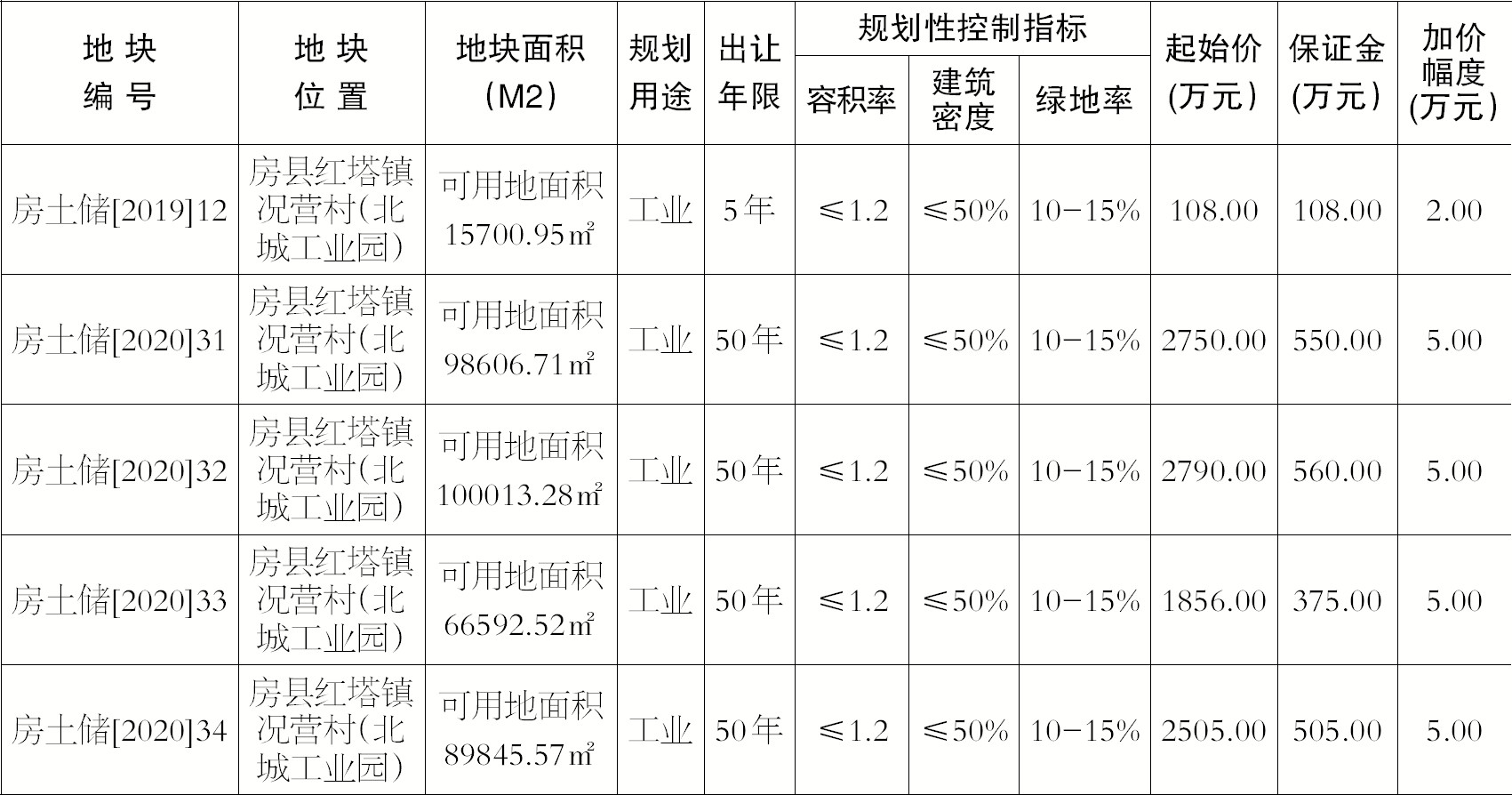 竞得房土储〔2019〕12号、房土储〔2020〕31号、房土储〔2020〕32号、房土储〔2020〕33号、房土储〔2020〕34号地块必须按照城市规划拟定工业用地详规进行建设。具备竞买条件的请于2020年12月17日下午5:30时前,到房县自然资源和规划局二楼土地收购储备中心提出竞买申请并报名,接受资格审查,经审查符合竞买资格者方可领取国有建设用地使用权出让文本,并交付竞买保证金。竞买保证金必须在报名期限内到房县土地收购储备中心指定的银行缴付,竞得土地使用权后保证金可抵作出让价款,未竞得者,挂牌成交后7日内办理退款手续(不计息)。