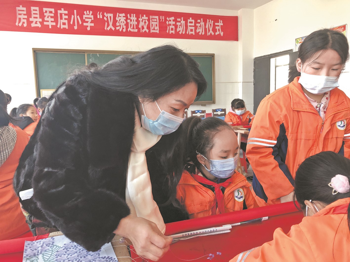 近日,湖北省汉绣传承人黄春萍来到军店镇军店小学,为100余名学生开展汉绣技艺培训,现场讲解汉绣科普知识、基础针法、技艺和注意事项等内容。据了解,本期“汉绣进校园”军店小学培训时间为期8天,主要利用学校周末时间和学生的兴趣课时间,让孩子们在一针一线中品味汉绣艺术之美,感受传统文化的博大精深。