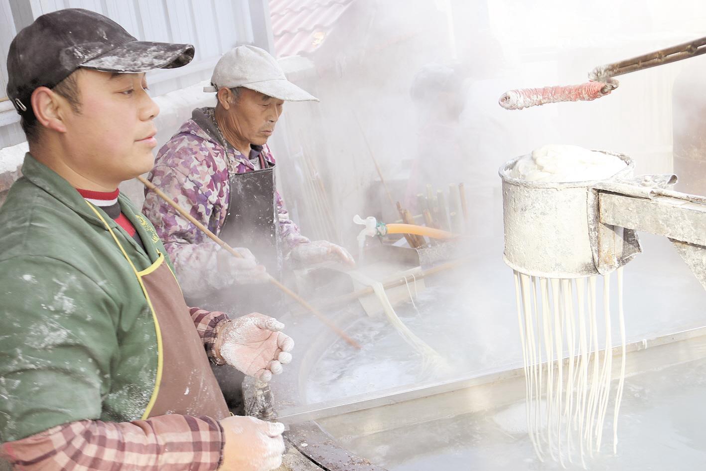 近日,军店镇军马村村民吴先文正和父亲一起做红薯粉条。近年来,军店镇将红薯粉列为扶贫产业给予支持,对有愿意带动扶贫的市场主体给予支持;注册“军马红薯粉”集体商标,供全镇所有的市场主体免费使用;申请把红薯产业纳入全县产业奖补范围,争取3年内培育10家规模以上的市场主体。 (刘智宝 摄)