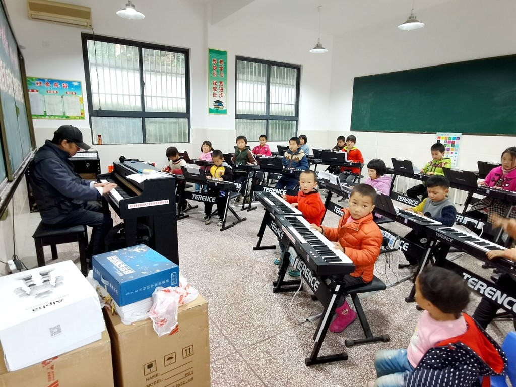 近日,白鹤镇黄堰小学学生在湖北香城智能机电产业技术研究院为该校援建的音乐教室里,第一次用上了电子琴。该研究院共捐赠数码钢琴1台、数码电子琴20台,并为每一个孩子赠送一套科学实验套装,让他们自己动手进行科学实验。(孙波 何良新 摄)