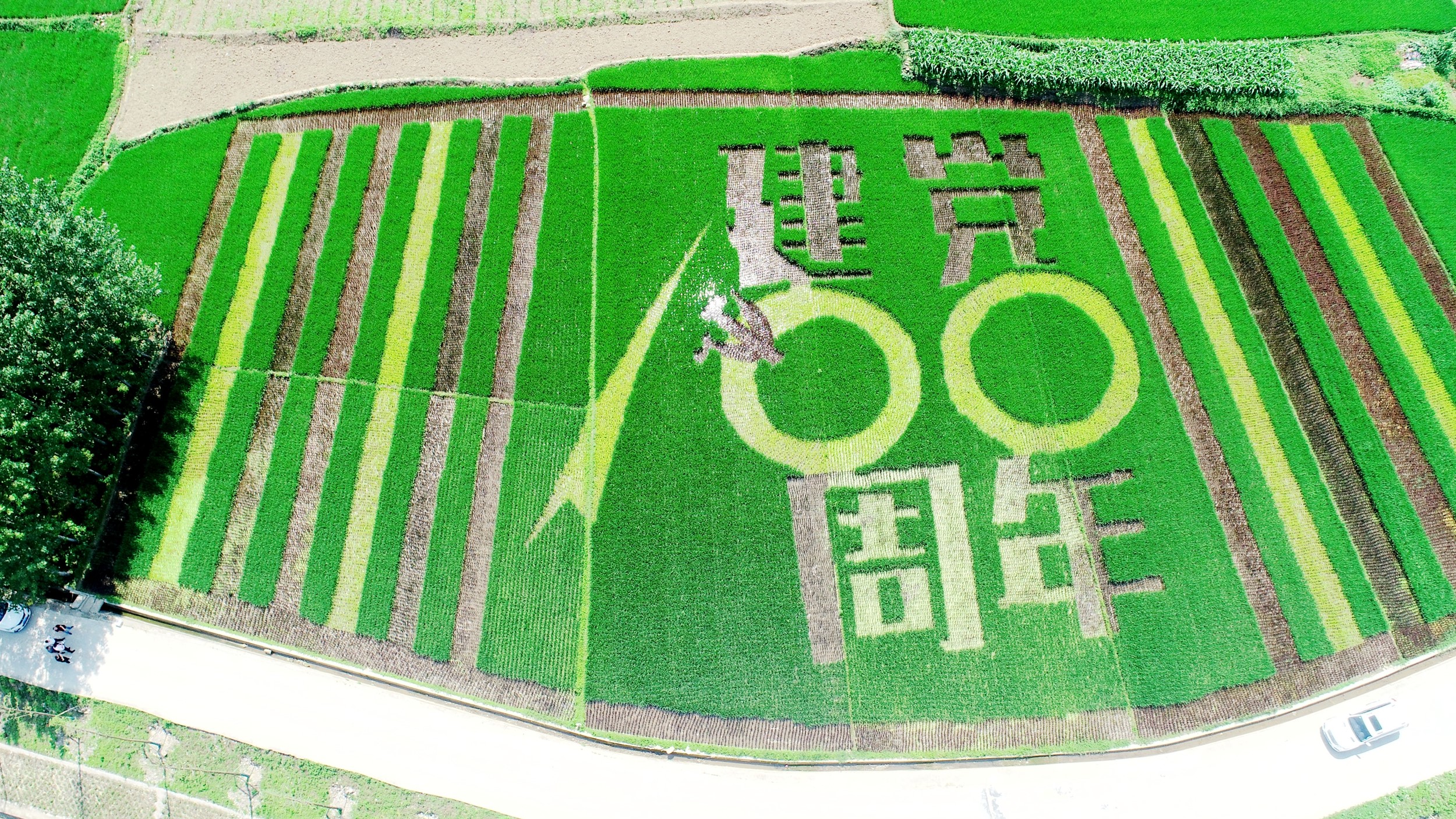 大地为纸,稻穗为笔,一幅碧绿色稻田画卷在城关镇三海村徐徐铺开。在建党 100 周年之际,我县农技人员以绿色稻田为底,用五颜六色稻禾绣图生动勾勒出对中国共产党的深情祝福。 (柯勇 摄)